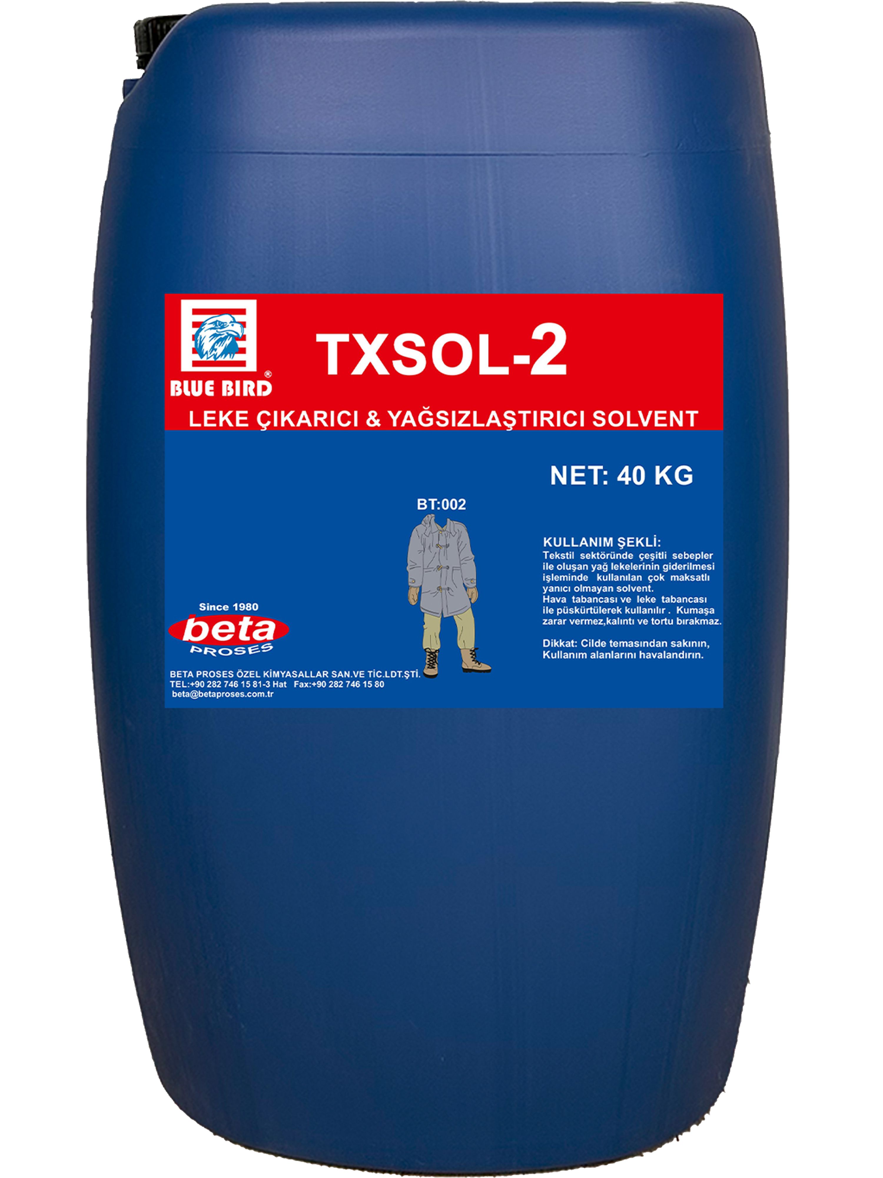 Dry cleans the spots of machine oils, vegetable oils on fabrics in a very fast way. Never remains any residue or moire. Removers or weakens some kinds of ink spots. This product can easily be applied on all woolen, cotton, velvet, silk, synthetic-orlon-nylon mixture fabrics such as clothes, shirts, ties, hats, upholstery, carpets etc. TXSOL-2 is the powerful nonflammable cleaning liquid. As it evaporates in longer time compared to TXSOL-1, it is effective on harder spots. Produced for industrial usage. It should be sprayed on the spots directly by a pressure gun.