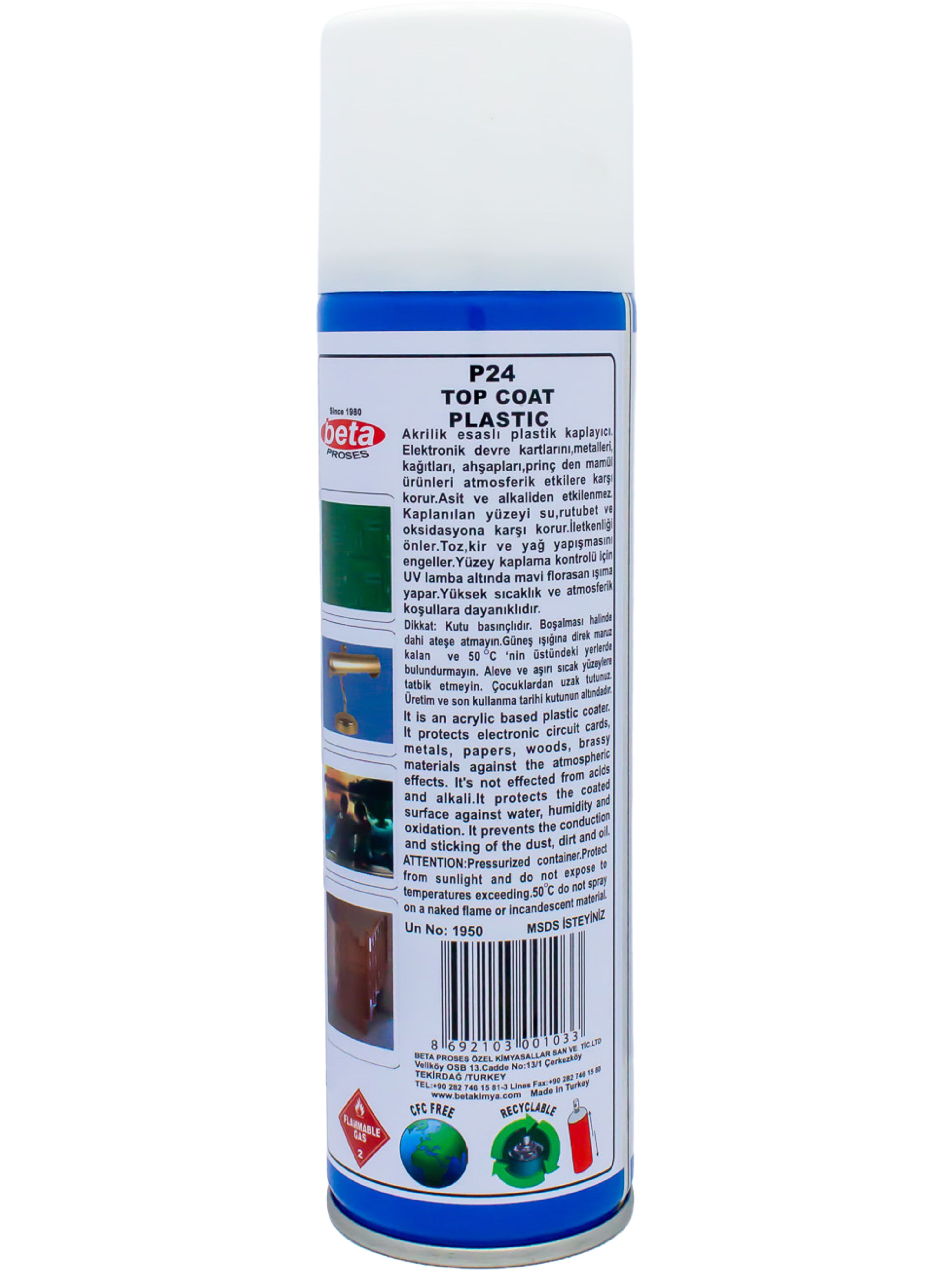 It is an acrylic-based plastic coater. It protects electronic circuit boards, metals, papers, woods, and brass-made products against atmospheric effects. It is not affected by acids and alkalis. It protects the coated surface against water, humidity, and oxidation. It prevents conduction and sticking of dust, dirt, and oil. It does not contain harmful materials for human health and the environment.