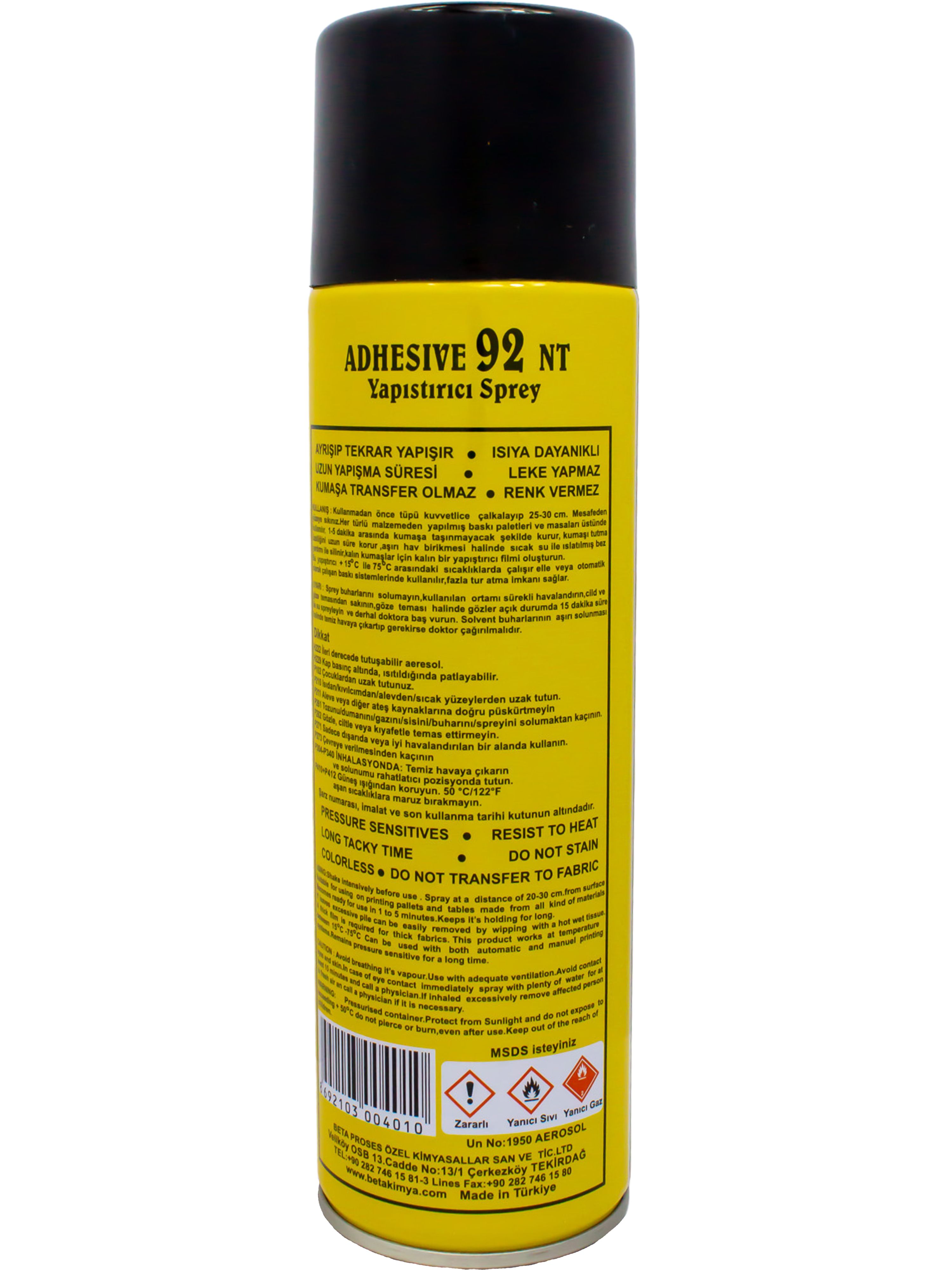 During the serigraphy printings, the usage of Adhesive 92 prevents the sliding of fabrics and t-shirts on the palette, ensuring a clean and quality printing. Adhesive 92 holds the fabric perfectly between 15-75°C and can work for 4 rounds in automatic printing machines. It normally does not transfer to the fabrics, but even if it does, it can be easily removed during the fixing phase. It does not contain any dangerous material for human health. It is presented in 500 ml economic cans.
