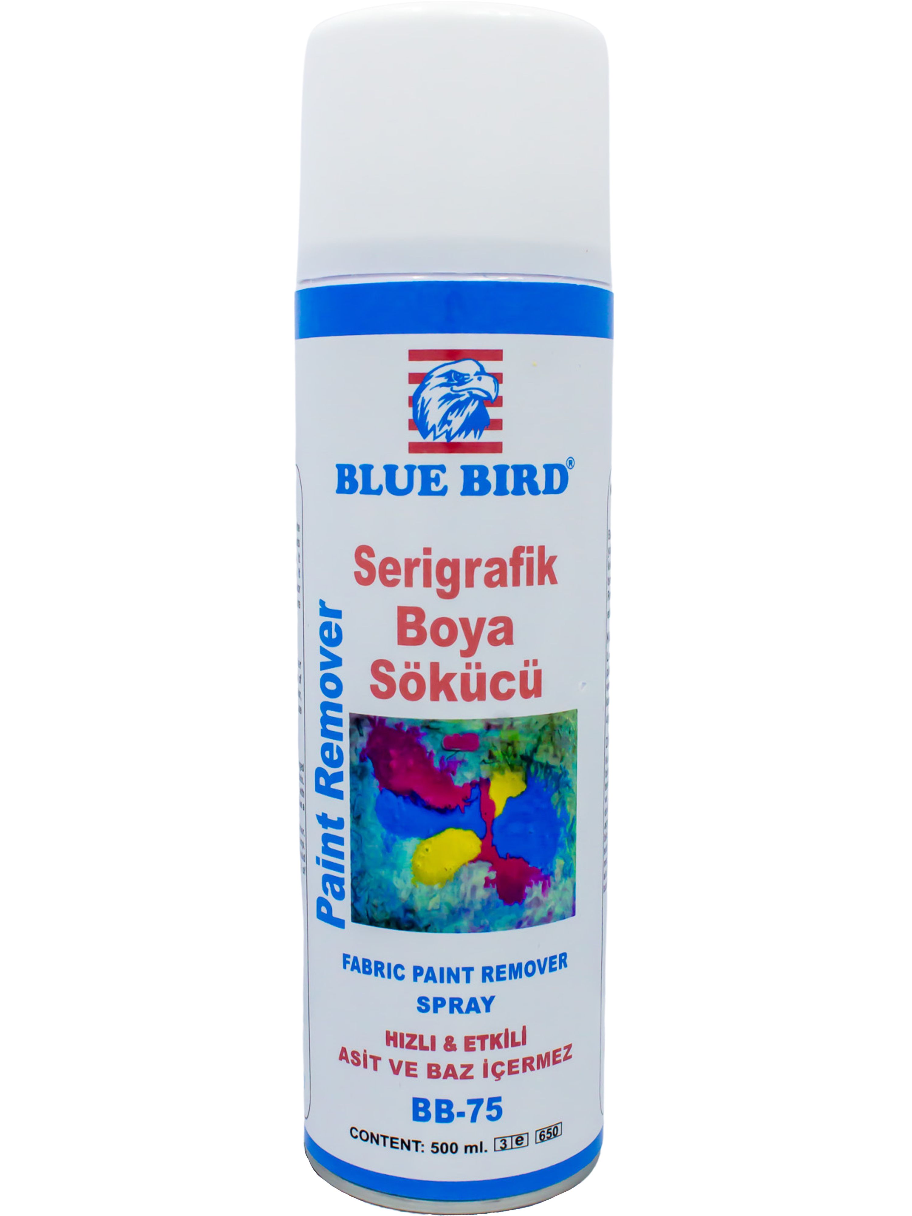 Blue Bird Boya Sökücü Sprey, kumaşlardaki yağlı boya ve serigrafik baskılardaki boya lekelerini ortadan kaldırır. Hızlı ve etkili bir temizlik sağlar. Asit ve baz içermez. Renk ve kumaş hassasiyeti önceden test edilmelidir.